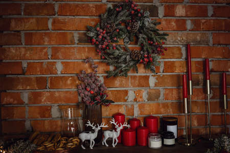 Cozy living room interior with fireplace, Christmas wreath and candles