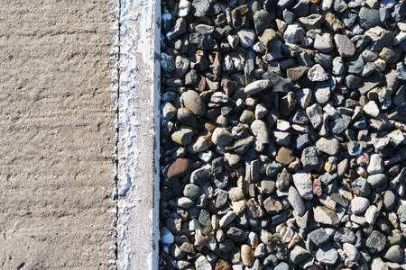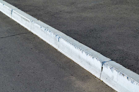 Protective border between asphalt road and pavement. The border and concrete is painted with white paint. The asphalt is rough and smooth. The border diagonally divides the space into two parts.