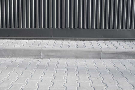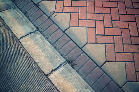 Brick pavement tile on a street near industrial building. Urban texture as background.