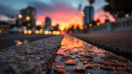This image captures a roadside perspective of a city at dusk. The foreground reveals a textured road surface with water reflecting the colorful sunset. Bokeh lights from city buildings create a blurred background. Suitable for various commercial and editorial applications.