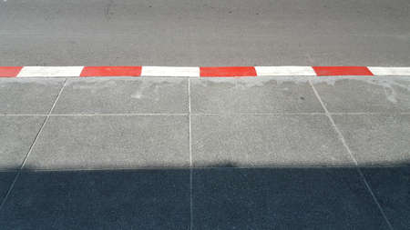 Selective focus of White and red stripes on the sidewalk with sunlight
