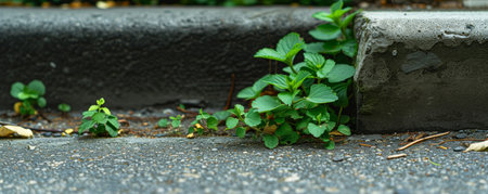 Green plants growing through urban concrete pavement