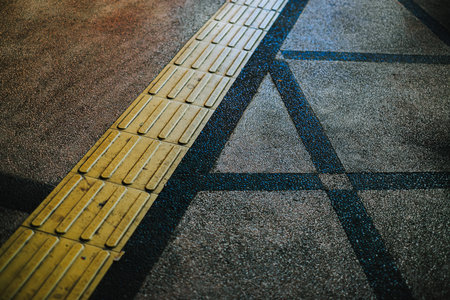 Colored concrete street sidewalk with yellow tactile lines for visually impaired people