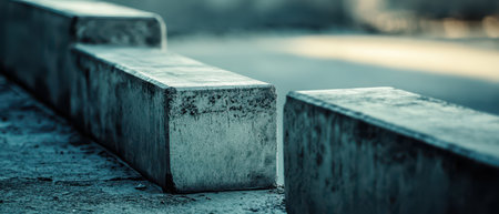 Concrete blocks are arranged along the edge of a calm pathway under soft lighting creating an urban ambience during the early morning hours.