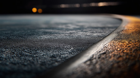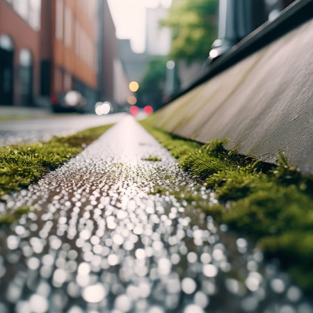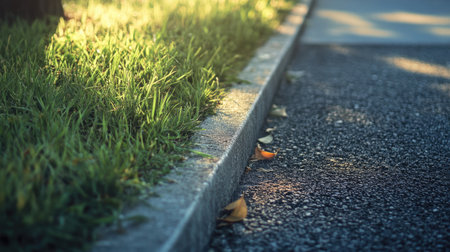 A captivating close-up of the edge where lush grass meets a smooth asphalt surface, beautifully illuminated by soft sunlight, creating a serene urban scene.