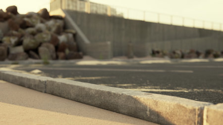 Golden sunlight bathes the curving edges of a quiet road as it meets a concrete wall, creating a serene setting for evening strolls and reflective moments.
