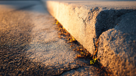 Captivating close-up of lush green grass growing along a concrete curbside with soft sunlight illuminating the scene, creating a serene urban ambiance.