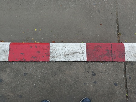 Concrete sidewalk with red and white curb