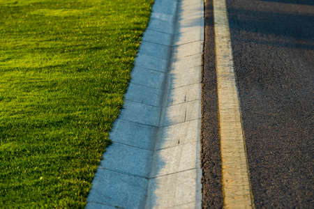 Asphalt Surface Separated By Concrete Border. Road And Sidewalk Divided By Newly Installed Concrete Curb.