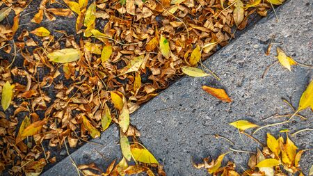 Dry yellow leaves on the sidewalk in autumn fall on a sunny day