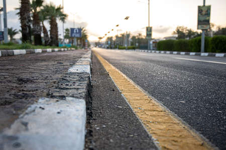 Close up city asphalt road with palm trees along the road at sunset.