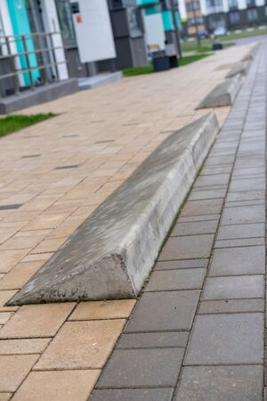 Car parking bar in the area close to Shopping Center. Outdoor parking area with yellow concrete bars. Street view, selective focus, nobody