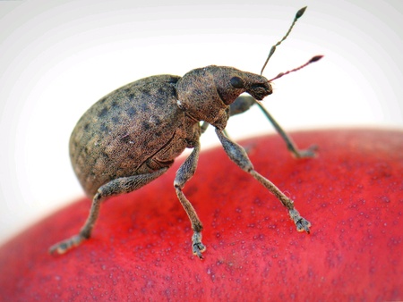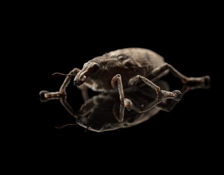 Macro of snout beetle (Otiorrhynchus sulcatus) on reflective plate, low angle view