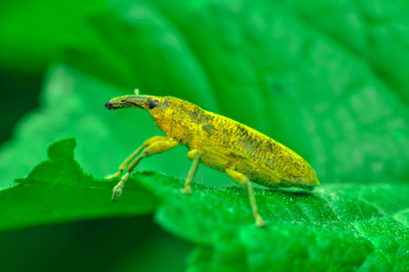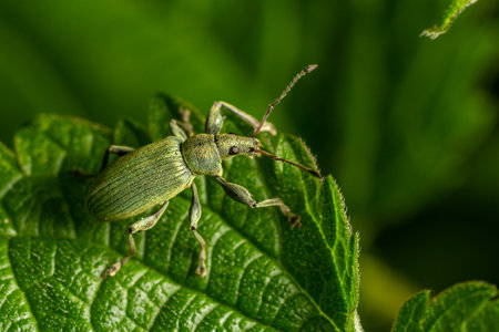 Green weevil insect resting on a leaf in a lush garden environment during daylight hours showing intricate details of its body and texture.