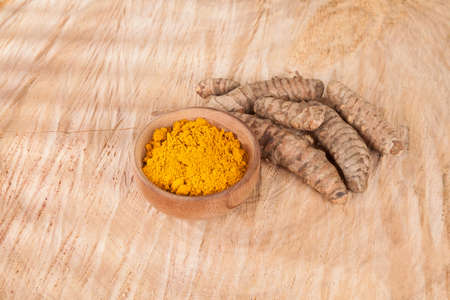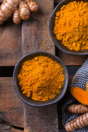 Turmeric powder and fresh turmeric in wooden bowls with green leaf on old wooden table. Herbs are native to Southeast Asia.