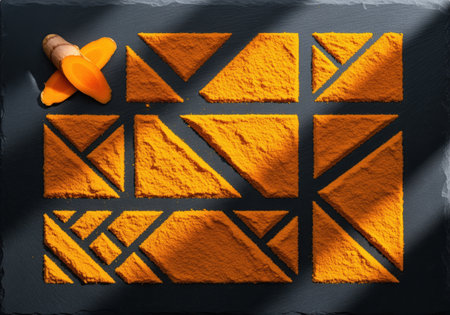 A creative flat lay composition showing bright yellow turmeric powder formed into precise geometric triangle shapes alongside fresh root slices on a textured black slate background with shadows.