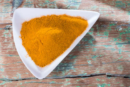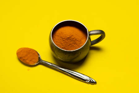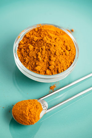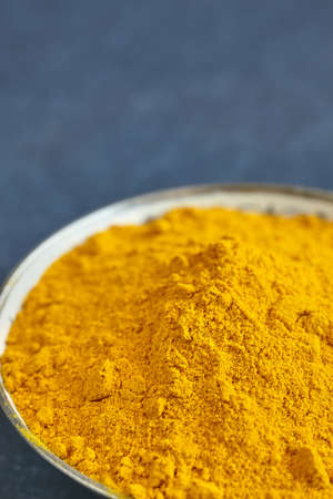 Close up picture of turmeric powder in a bowl, shallow depth of field, space for text.