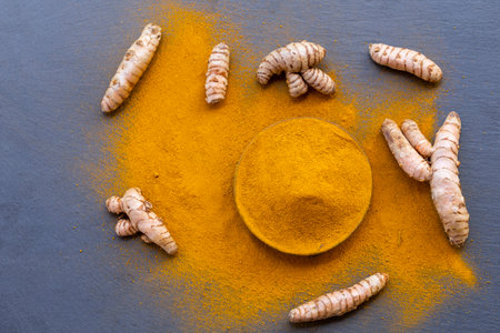 Fresh and ground turmeric root on a slate background