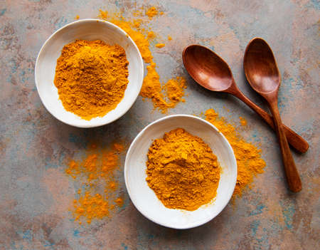 Bowls with turmeric powder and wooden spoons on a concrete background
