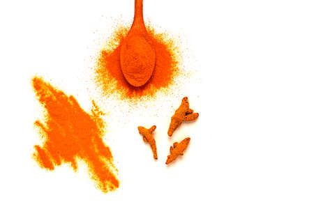 dry Turmeric and turmeric powder on white background, horizontal and top view
