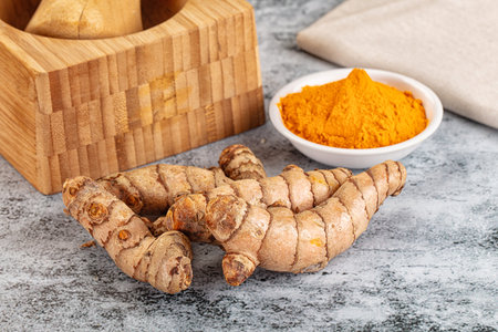 Fresh aroma tumeric roots heap served powder