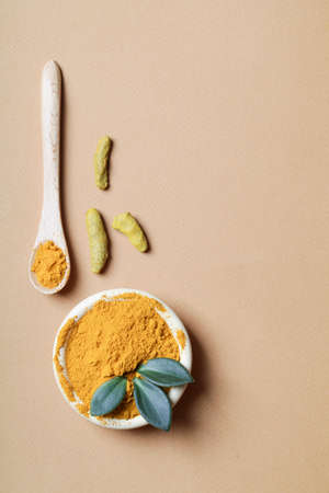 health care lifestyle concept. Curcuma Longa or turmeric powder in bowl with green leaf, wooden spoon and turmeric root on beige background.copy space