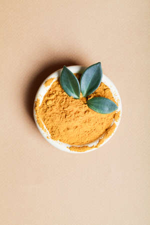 diet nutrition, health care lifestyle concept. Curcuma Longa or turmeric powder in bowl with green leaf on beige background