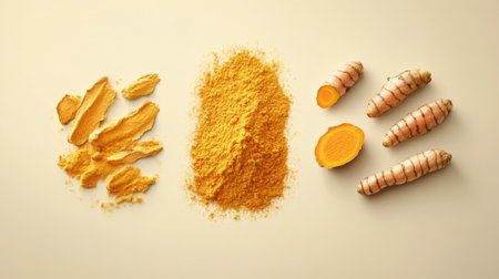 A visually appealing arrangement featuring turmeric in its various forms: raw roots, bright yellow powder, and fresh slices. Perfect for culinary or wellness use.