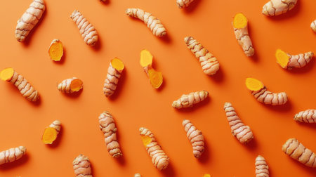 A visually appealing arrangement of fresh turmeric roots and slices on a bright orange backdrop, highlighting their vibrant colors for culinary and health applications.