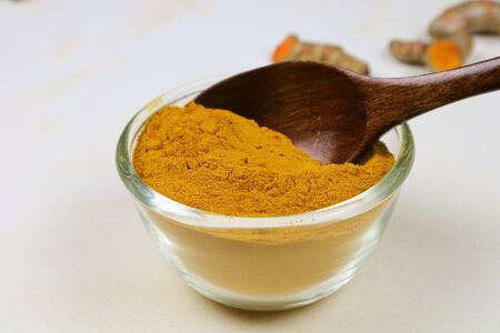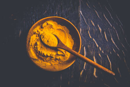 Indian turmeric powder, curcuma spice in small bowl with spoon, Haldi powder on wooden background