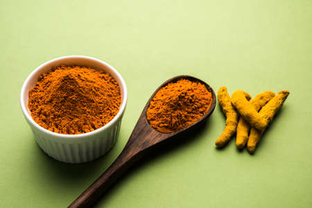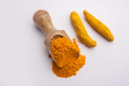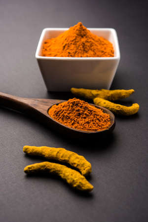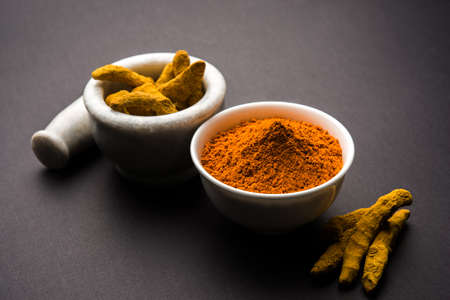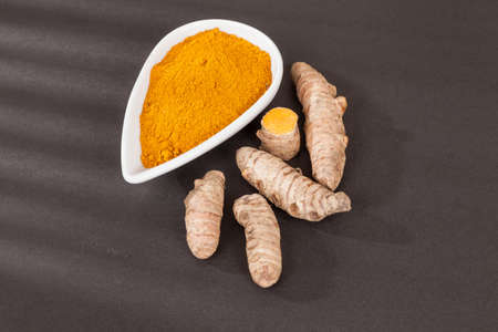 Fresh turmeric or curcuma root and dried powder, wildly used in Asia and India as spice, food ingredient and for medicinal purposes close up