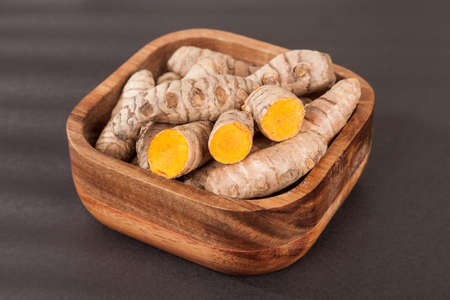 Raw organic orange turmeric cut root on wooden background. Indian oriental low cholesterol spices. Diet nutrition, health care concept.