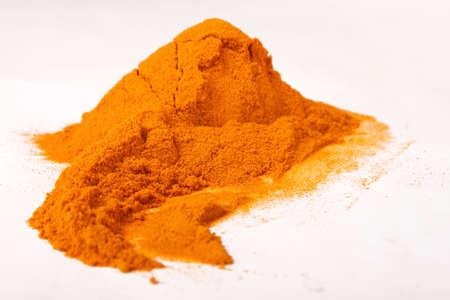 A pile of the colorful spice, ground turmeric or curcumin on a white background