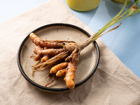 turmeric fresh on blue background. concept healthy spice diet.