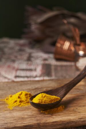 Eastern condiments scattered on a table at home. Turmeric and pe