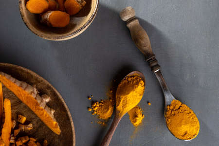 Turmeric powder and fresh turmeric root on gray concrete background with copyspace. Spice, natural coloring, alternative medicine.