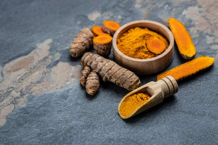 Turmeric root and turmeric powder on gray stone background. Close up view.
