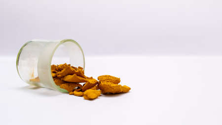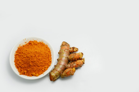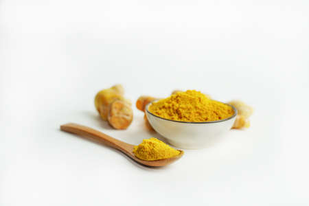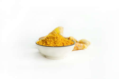 Turmeric powder in a glass cup and turmeric root isolated on a white background is an ingredient in turmeric foods and ingredients in skin care products. Turmeric helps the skin to be strong.