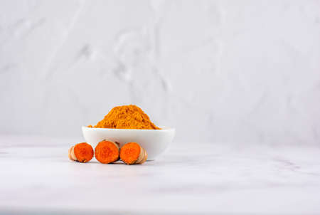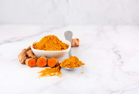 Bowl with turmeric powder with several roots of the same plant on a marble table. Concept of natural medicine and homeopathy