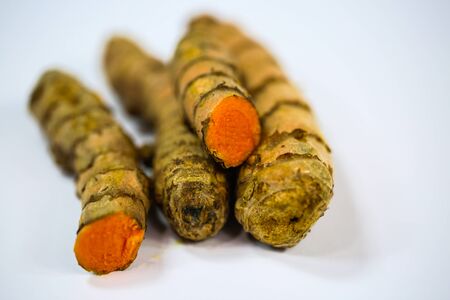 Fresh turmeric on white background,raw material for cooking. Close up.
