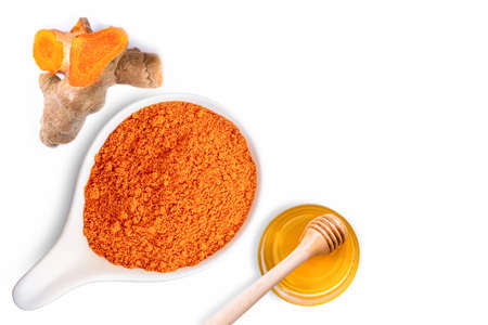 Turmeric power in ceramic bowl and fresh curcuma root with glass of honey isolated on white background. Top view.
