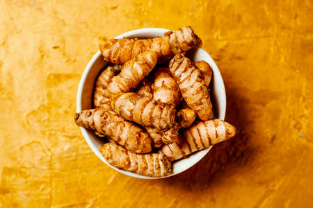 high angle view of some turmeric roots, curcuma longa species, in a ceramic bowl placed on a golden textured surface