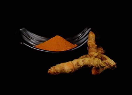 Turmeric root and powder on black background