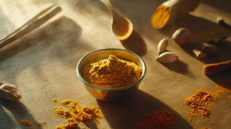 A vibrant bowl of turmeric spice sits on a wooden table, surrounded by various cooking ingredients. The warm, natural light highlights the textures and colors, creating an inviting atmosphere for culinary inspiration.