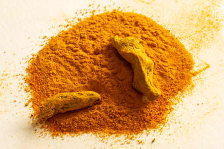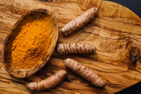 Food and drink, diet nutrition, health care concept. Raw organic orange turmeric root and powder, curcuma longa on a cooking table. Indian oriental low cholesterol spices