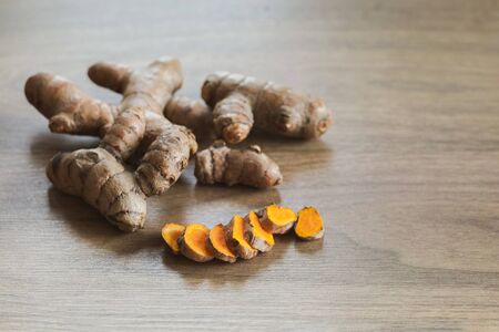 Fresh turmeric on wood table Thai herb concept.