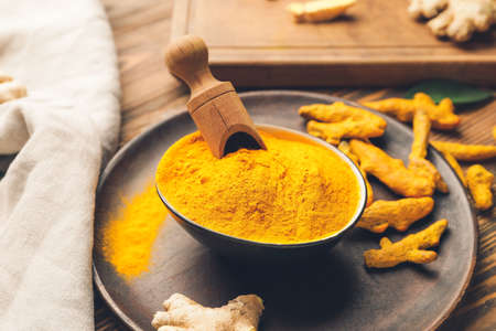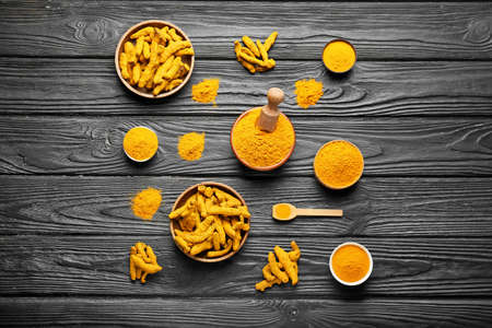 Composition with aromatic turmeric on wooden background