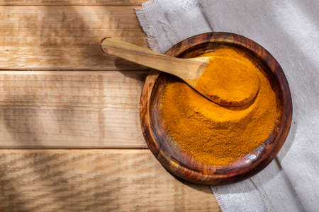 Indian turmeric powder, curcuma spice in small bowl with spoon, Haldi powder on wooden background