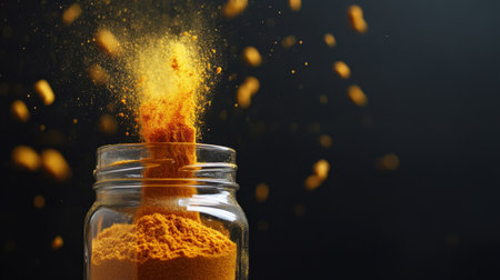 A stunning close-up image of vibrant turmeric powder bursting from a glass jar, creating an eye-catching explosion against a dark background, perfect for food-related projects.