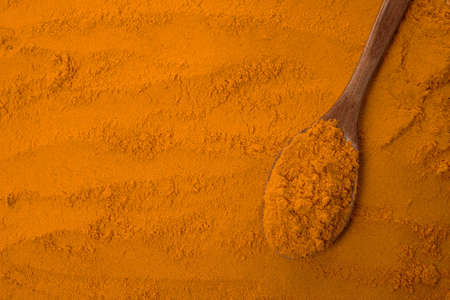 Turmeric powder on a metal spoon obove a curcuma background, top view with copy space